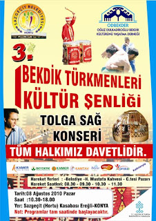 Bekdik Türkmenleri Kültür Şenliği 8 Ağustos Pazar günü Konya'nin Ereğli İlçesi Sargeçit (Hortu) Kasabasında yapılacak. Birçok etkinliğin yer aldığı şenlikte Tolga Sağ da konser verecek. 10.30'da başlayacak şenliklerin saat 18.00'e kadar sürmesi bekleniyor.